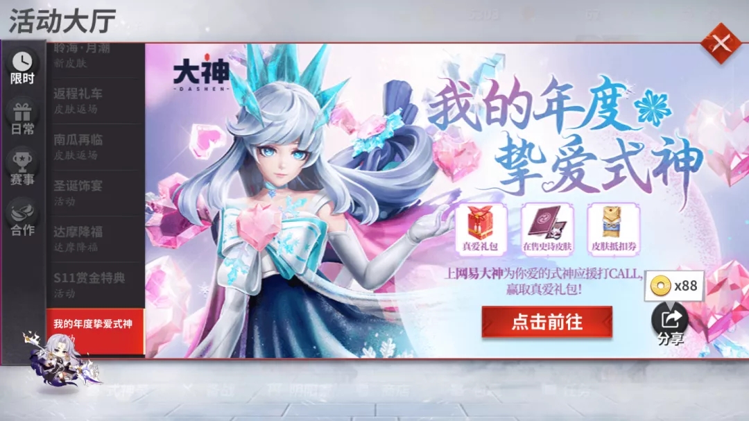 在网易大神#年度挚爱式神#话题下,晒出你最喜欢的式神并附上你的真情告白,为TA应援打CALL,赢取史诗皮肤/皮肤抵扣券以及真爱礼包。