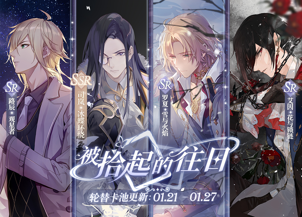 本期卡池中,司岚SSR「冰蝶环绕」、艾因SR「花与锁链」、罗夏SR「雪与火焰」、路辰SR「观星者」概率提升,画灵的获取概率占对应品级50%,在相同品级下均分概率。