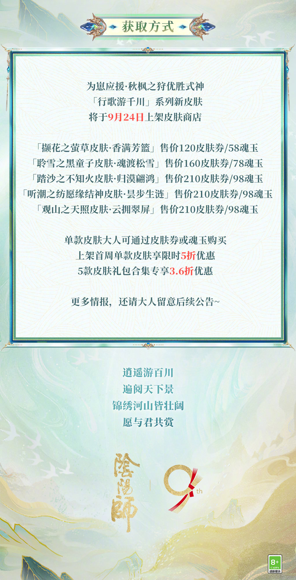 「为崽应援·秋枫之狩」优胜式神「行歌游千川」系列新皮肤即将上线,五款新皮肤细节鉴赏长图在此奉上!大人们可戳上一条皮肤鉴赏视频查看动态展示~