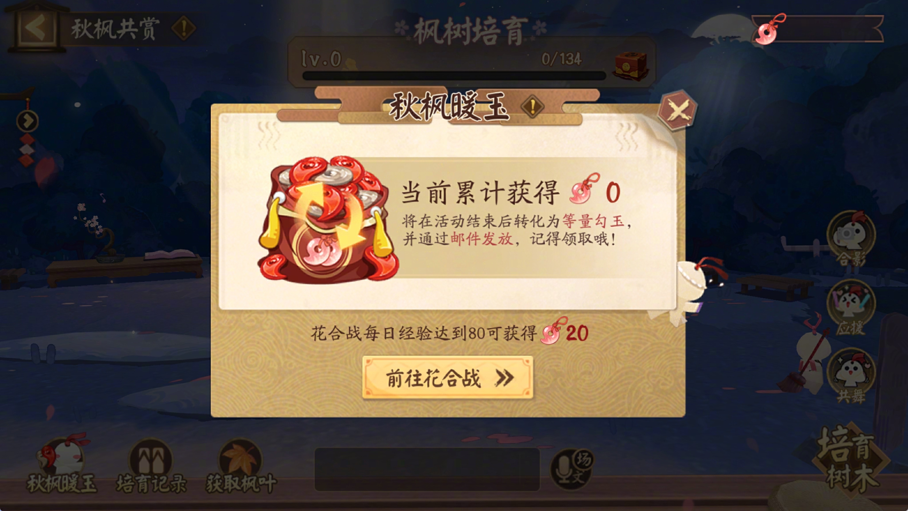 ※10月15日维护后-10月28日23:59,大人可通过日常玩法获取「秋韵红叶」,与寮友共同提升枫树的等级,解锁御行达摩、四星奉为达摩等寮秘宝奖励!完成每日花合战任务还可获取「秋枫暖玉」,该道具将在活动结束后转化为等额的勾玉。