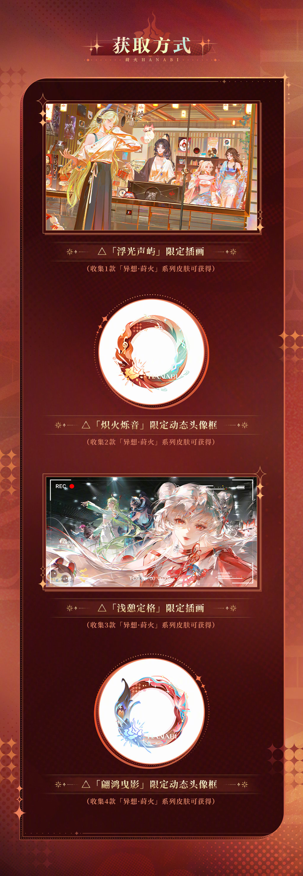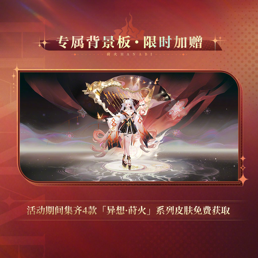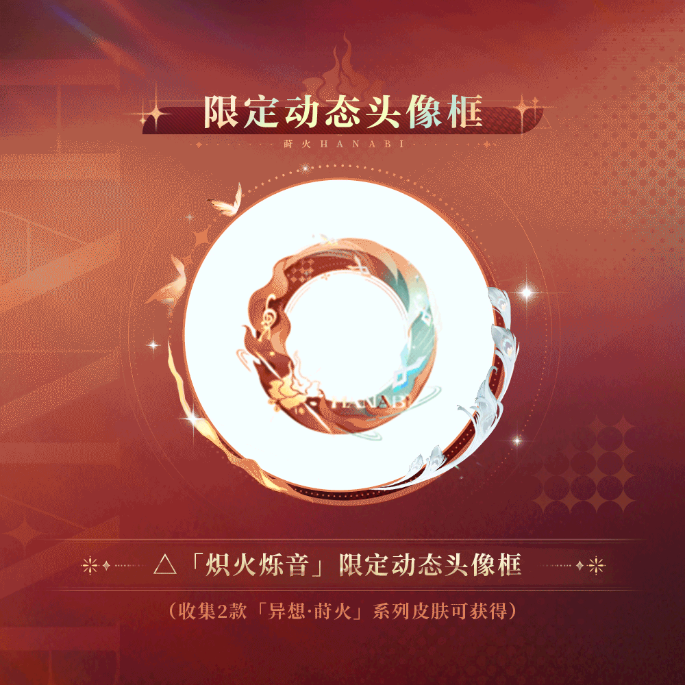 ※「异想·莳火」系列皮肤共4款,大人获得该系列的不同款数皮肤,可对应解锁限定插画「浮光声屿」、限定动态头像框「炽火烁音」、限定插画「浅憩定格」、限定动态头像框「翩鸿曳影」等收集奖励。
