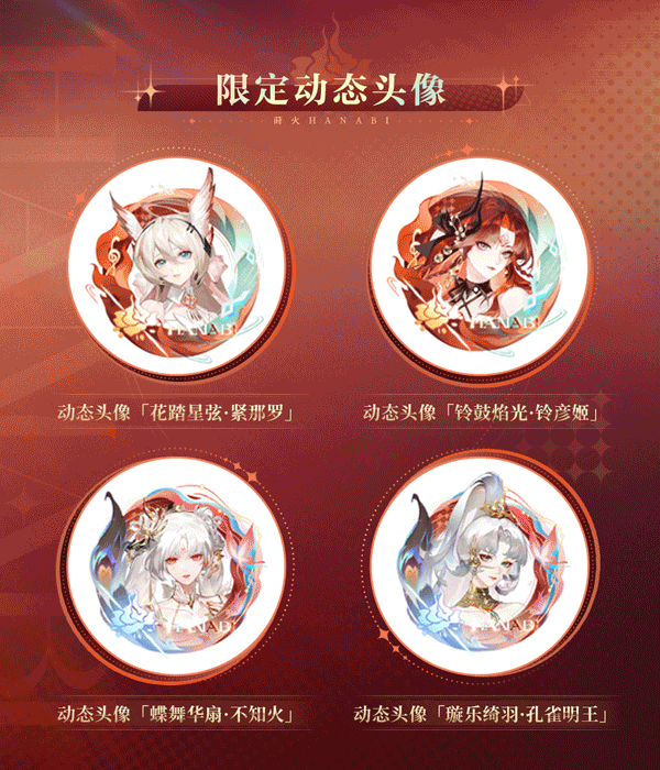 ※在「烬生华漪」活动中,大人还可获取4款动态头像「花踏星弦·紧那罗」 「铃鼓焰光·铃彦姬」 「蝶舞华扇·不知火」「璇乐绮羽·孔雀明王」,以及小动物「呼呼」。
