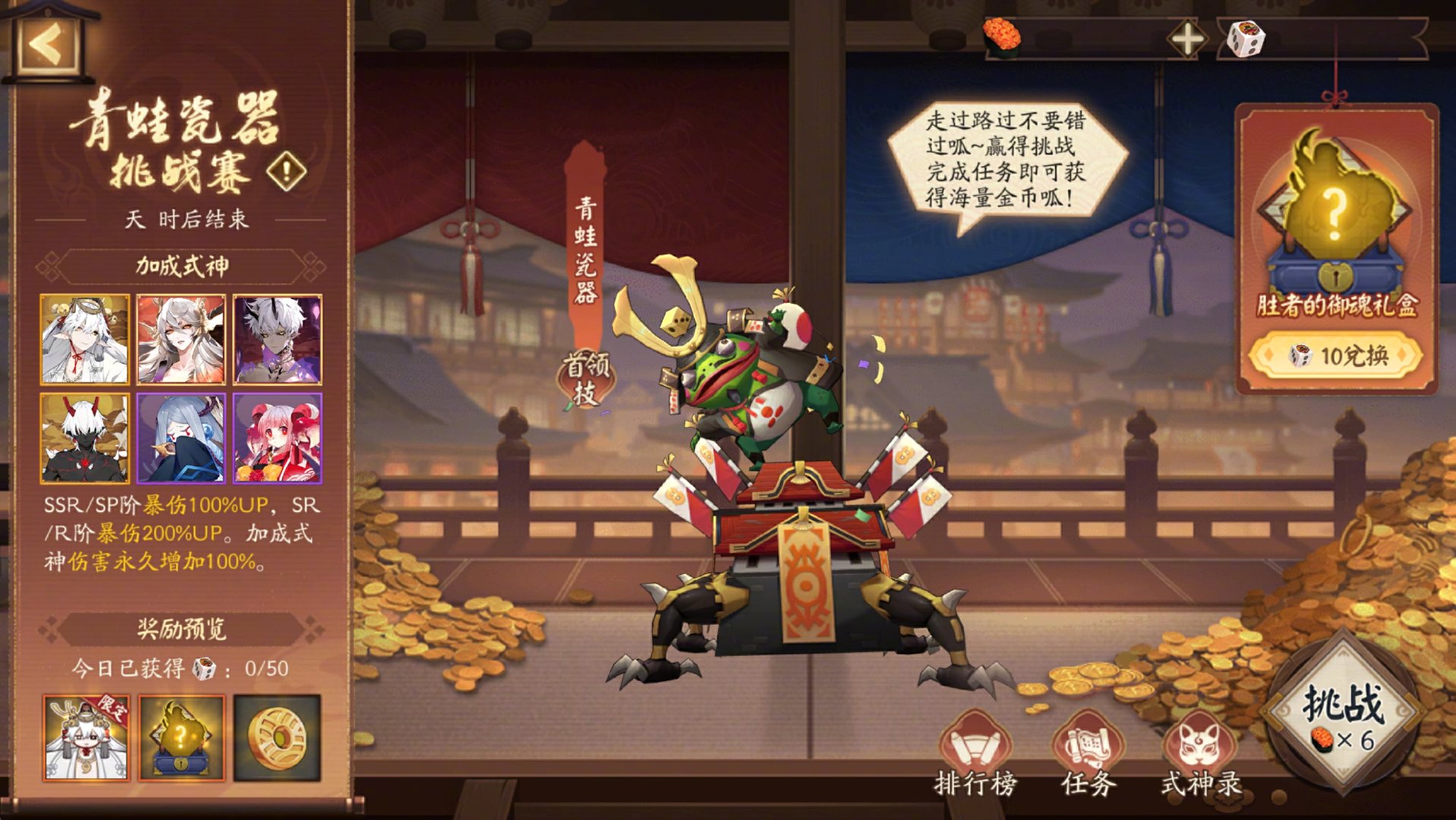 ※10月15日维护后-10月21日23:59,每日消耗体力参与挑战,获胜后将获得「神秘骰子」,可用于兑换「胜者的御魂礼盒」,完成挑战任务还可获得大量金币及活动限定表情包「可靠」!部分式神获得了海国护佑,挑战时使用这些式神可获得强力加成~