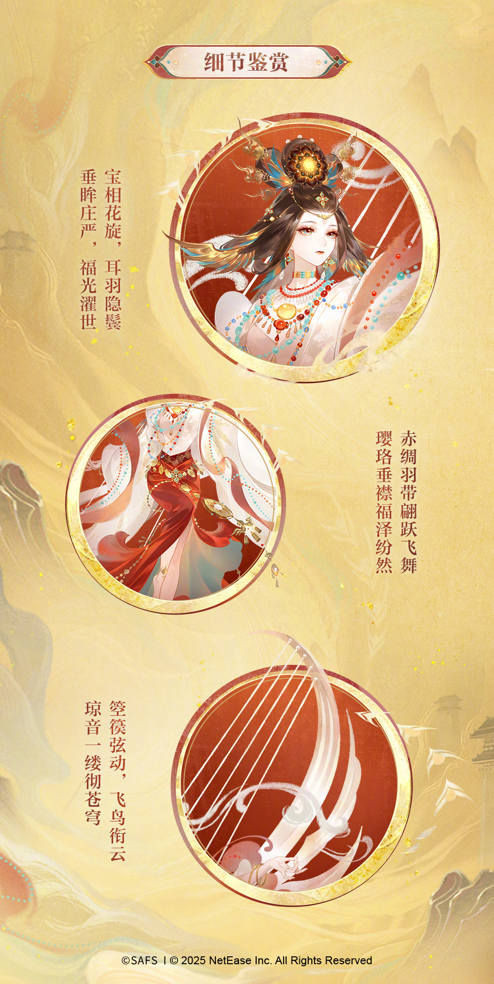 大人们可戳下方长图查看更多关于「言灵·朱谶玄枢」与「瑶音紧那罗·踏月游仙」新皮肤的细节鉴赏,以及限定动态头像框「绮音言华」 和专属插画「幻籁真境」~