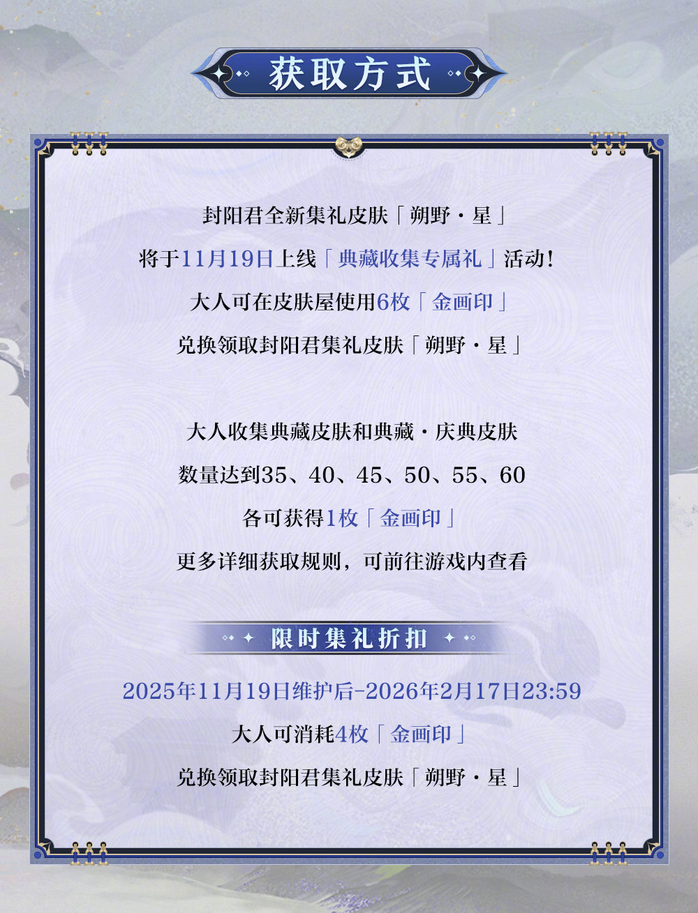 ※封阳君集礼皮肤「朔野·星」将于11月19日维护后上线,可通过「典藏收集专属礼」活动获取。