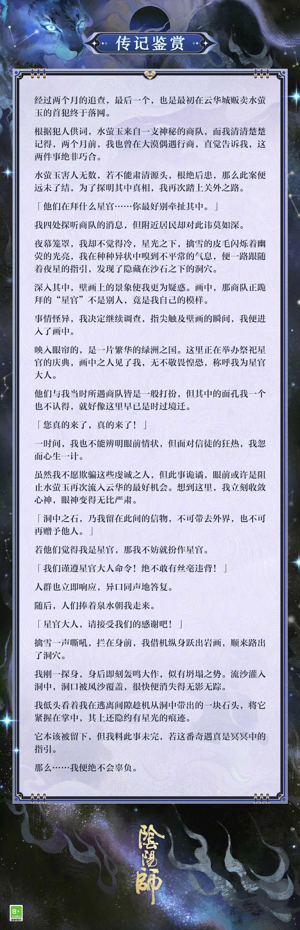 星官奇遇如真似幻,然为根绝祸源,名非我愿又何妨!纵使谜影重重、因果难溯,亦必将这清平人间还复万家。
