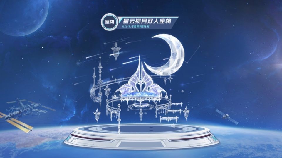 6月5日-8月4日摘星阁首发,水晶琉璃双人座椅,比风车座椅更佳唯美。悬在半空的弯月,水晶质感的护栏和阶梯,琉璃质感的靠背。流星特效,具体的动作等游戏内上架,亲身体验吧!