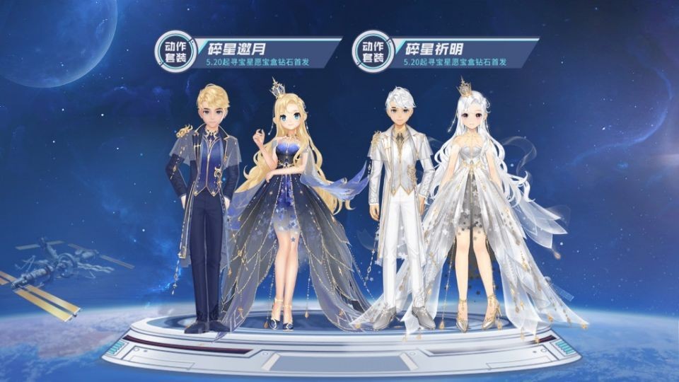 5月20日起,寻宝星愿宝盒钻石首发,女生飘逸的齐腰大波浪卷发,头戴金饰皇冠,银色流苏点缀。墨蓝色的抹胸礼裙,裙摆紫色蔷薇花点缀,外层薄纱都裁剪成花瓣样式,金丝镶边,就连衣袖只是薄纱一片外加仙气的飘带,金色流苏。男生金色微卷三七分短发,墨色假两件衬衣,金丝镶边,视觉上看上去貌似穿了同色马甲。墨蓝色长款礼服,肩部透明薄纱设计感十足,左肩上金饰也十分个性。两套动作套,虽说是同款只是颜色不同,但是整体看上去确实不一样了。星愿宝盒保底大概五百米两套,不过具体还是要看脸到底白不白。