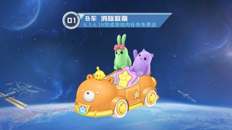 6月3日-6月19日,完成游戏内的任务免费获得。KIKI琦琦熊在天天爱消除里担任司机,做客飞车大陆直接变成了可爱的B车,DODO黄豆豆骑在萌熊头上,MEW喵星星和GOGO果兔兔在车尾变成了玩偶装饰。