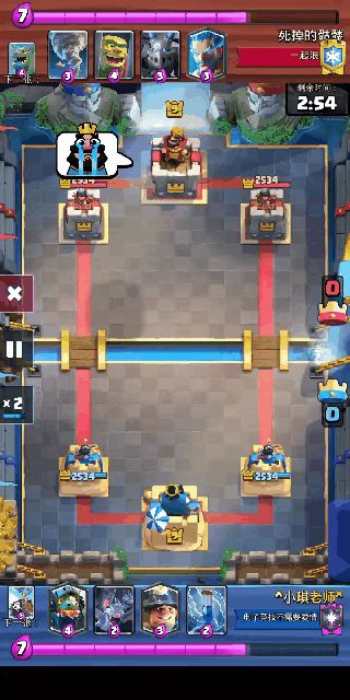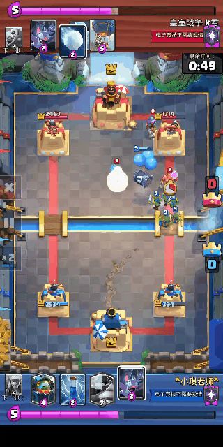先下一张骷髅气球。如果是地狱飞龙它先滋完骷髅气球后会被骷髅气球震开然后又会滋地上的小骷髅,所以保住了超骑。地狱塔不会被震开所以可能要补个小电。骷髅气球还有死亡伤害可以利用,虽然不多但用的好可以解决很多问题。过牌的话可以分路团伙、桥头投矛手或者沉底骷髅气球,都是不错的选择。