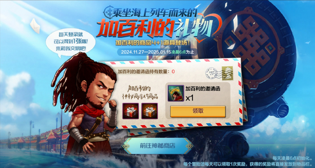 11月27日-2025年1月15日(凌晨6点)期间,加百利的商品4+1道具登场,勇士们每天登录可获得加百利的邀请函*1,可在神秘商店兑换加百利的礼物。每个冒险团每天可以领取1次奖励~