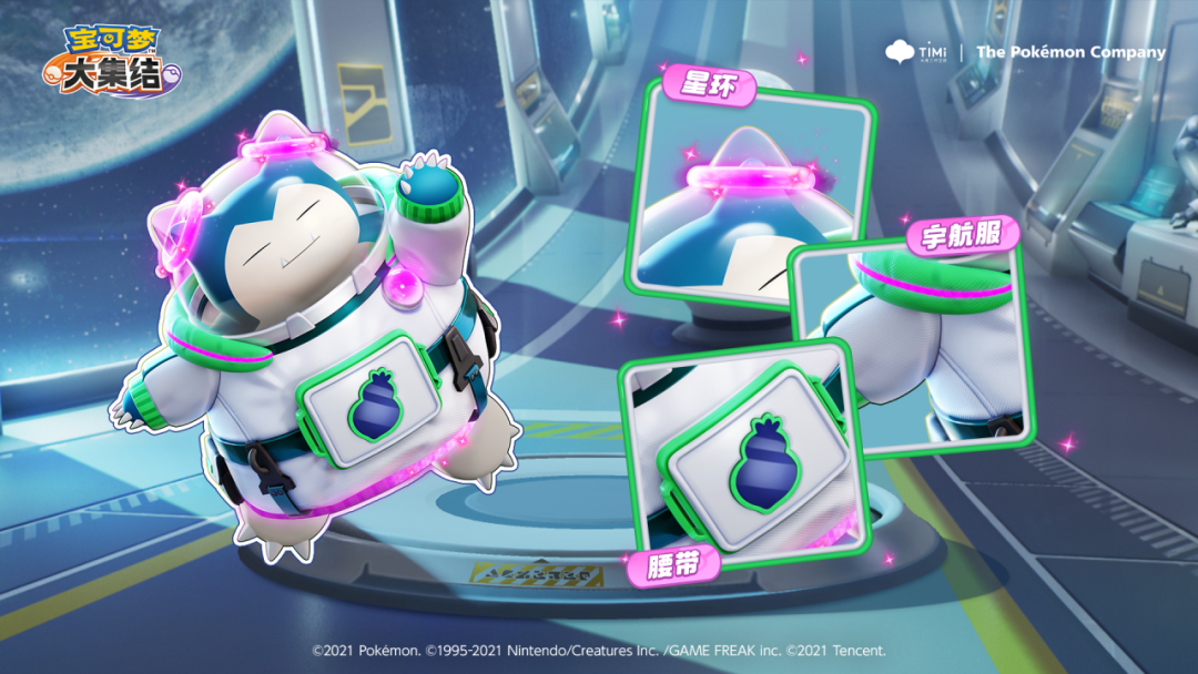 紫色的星环装饰在头盔上,带来了一抹十分不错的亮色,星光闪烁,也增添了一丝神秘。洁白的宇航服是阿锆为卡比兽打造的专属定制款,用绿紫白三色的腰带进行点缀,特制的树果图案是它最爱的食物,是这款电子服的点睛之处。也是卡比兽呼呼酣眠时,梦中的常客,带着返航的愿望,探索宇宙的奥妙。