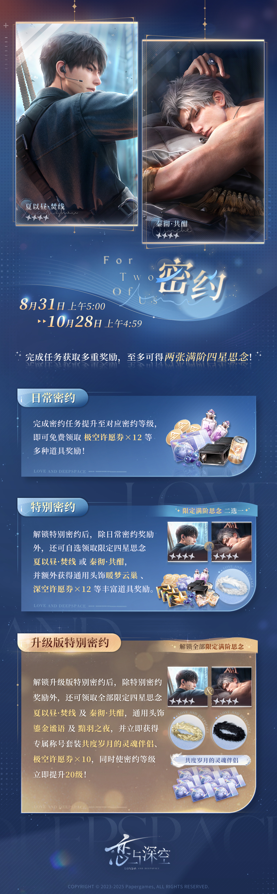 解锁特别密约后,除日常密约奖励外,还可自选领取限定四星思念「夏以昼·焚线」或「秦彻·共酣」;
