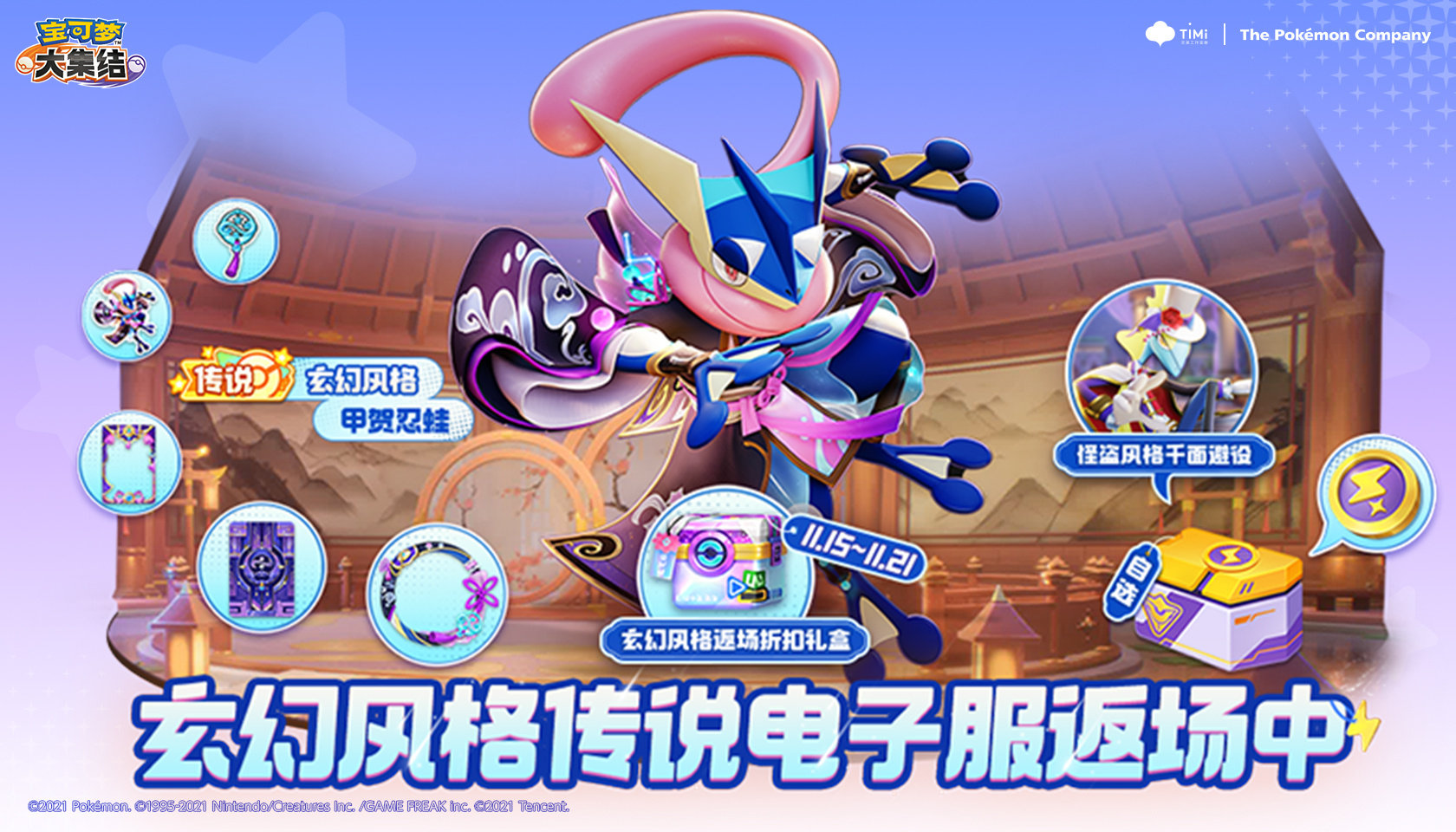 11月15日10点起,传说品质玄幻风格甲贺忍蛙电子服返场中!更有玄幻风格返场折扣礼盒在11月15日~11月21日开启!训练家们不要错过~