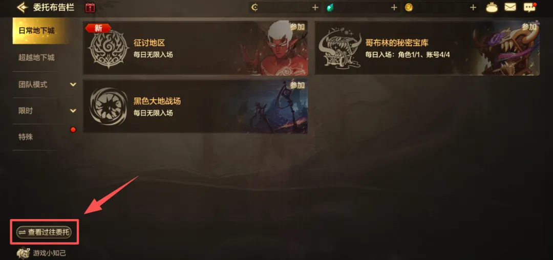当前版本委托布告栏界面中的周常地下城、勇士地下城、深渊:暴走研究所、深渊:塔尔坦炼器所玩法,将在新版本更新后移至过往委托中,团队模式、超越地下城页签将优先展示最新地下城。