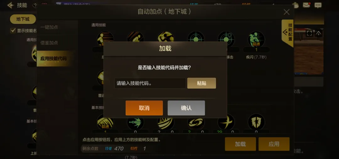如图所示,当获取到其他勇士分享的技能代码后,点击[应用技能代码]功能,即可粘贴技能代码,一键生成对应的技能加点。