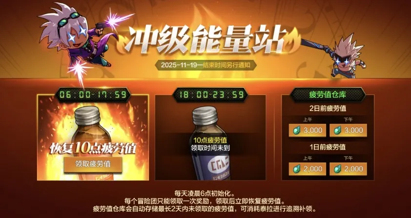 当前版本中,冲级能量站的20点疲劳值仅限当日领取。版本更新后,将新增疲劳值仓库,自动存储最长2天内未领取的能量站疲劳值,可消耗泰拉进行追溯补领。