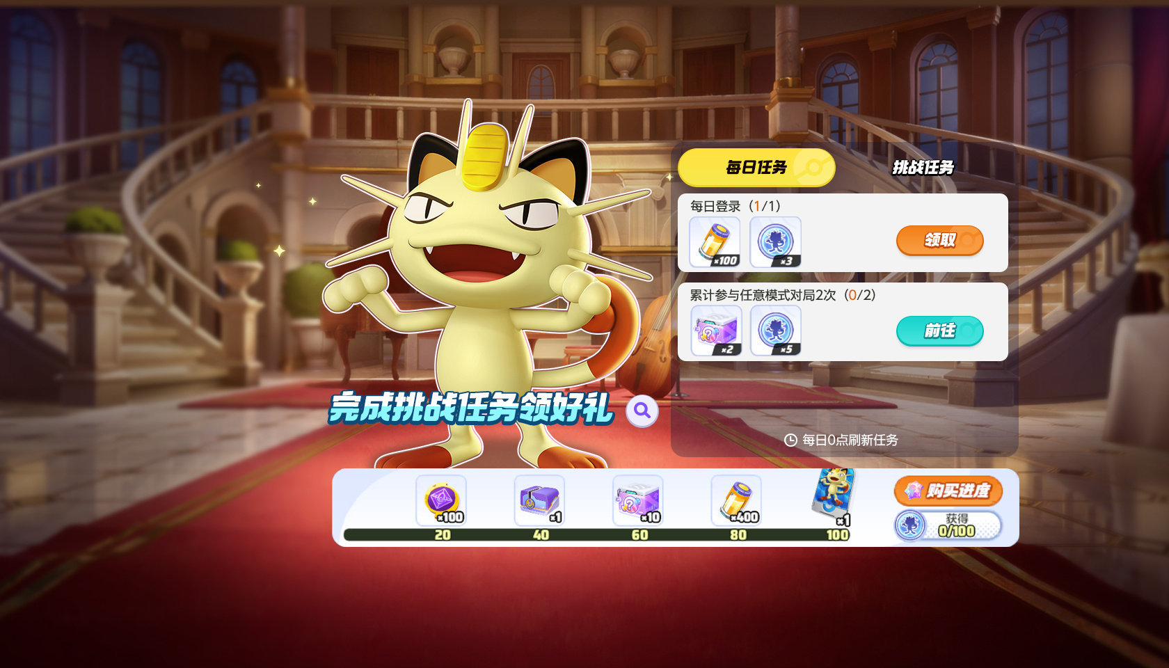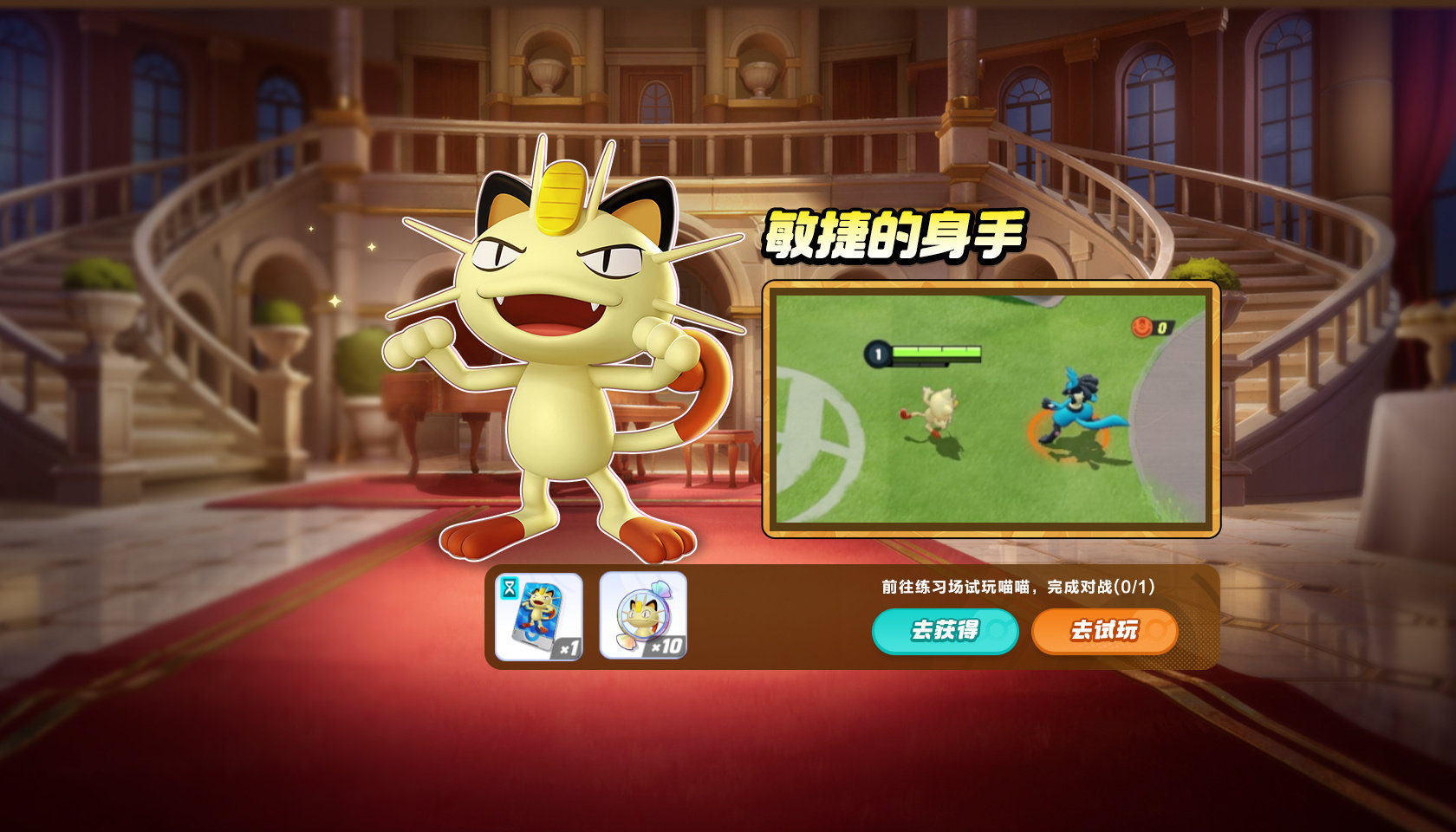 前往练习场试玩喵喵并完成相关挑战,可得喵喵租用参赛证和喵喵牵绊糖果!完成喵喵的挑战任务领好礼,既可得喵喵参赛证和多种精美好礼!训练家们快来和喵喵一起并肩作战吧!