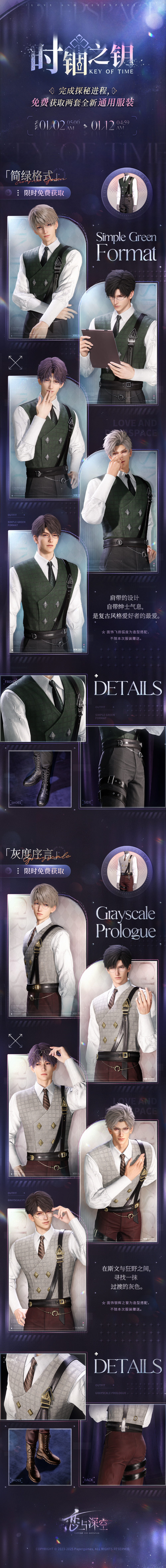 完成全部探秘进程,即可免费领取「钻石*1000」、男主通用服装「简绿格式」「灰度序言」及丰富培养道具奖励!
