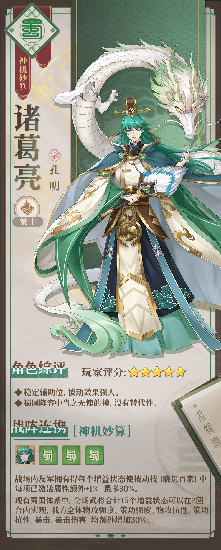 只要还在玩蜀国阵容,诸葛亮几乎就是最稳定的辅助位,自身被动效果过于强大,怒气技甚至回合技能都属于添头,有就是赚到。