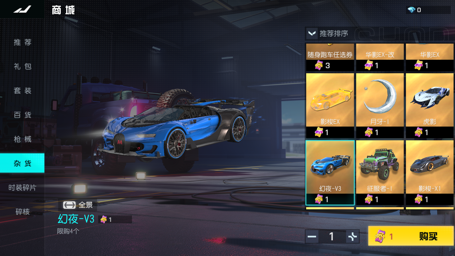 商城-杂货界面新增橙色载具幻夜-V3,可以消耗橙色载具任选券进行兑换。
