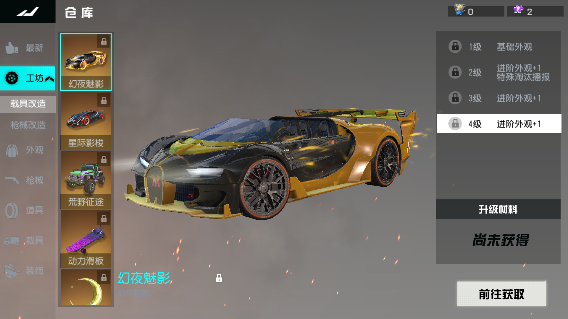 仓库-升级界面新增幻夜-V3载具升级,玩家分解幻夜-V3后可以获得对应的幻夜核心。消耗幻夜核心和时装碎片即可升级幻夜魅影,获取新外观。
