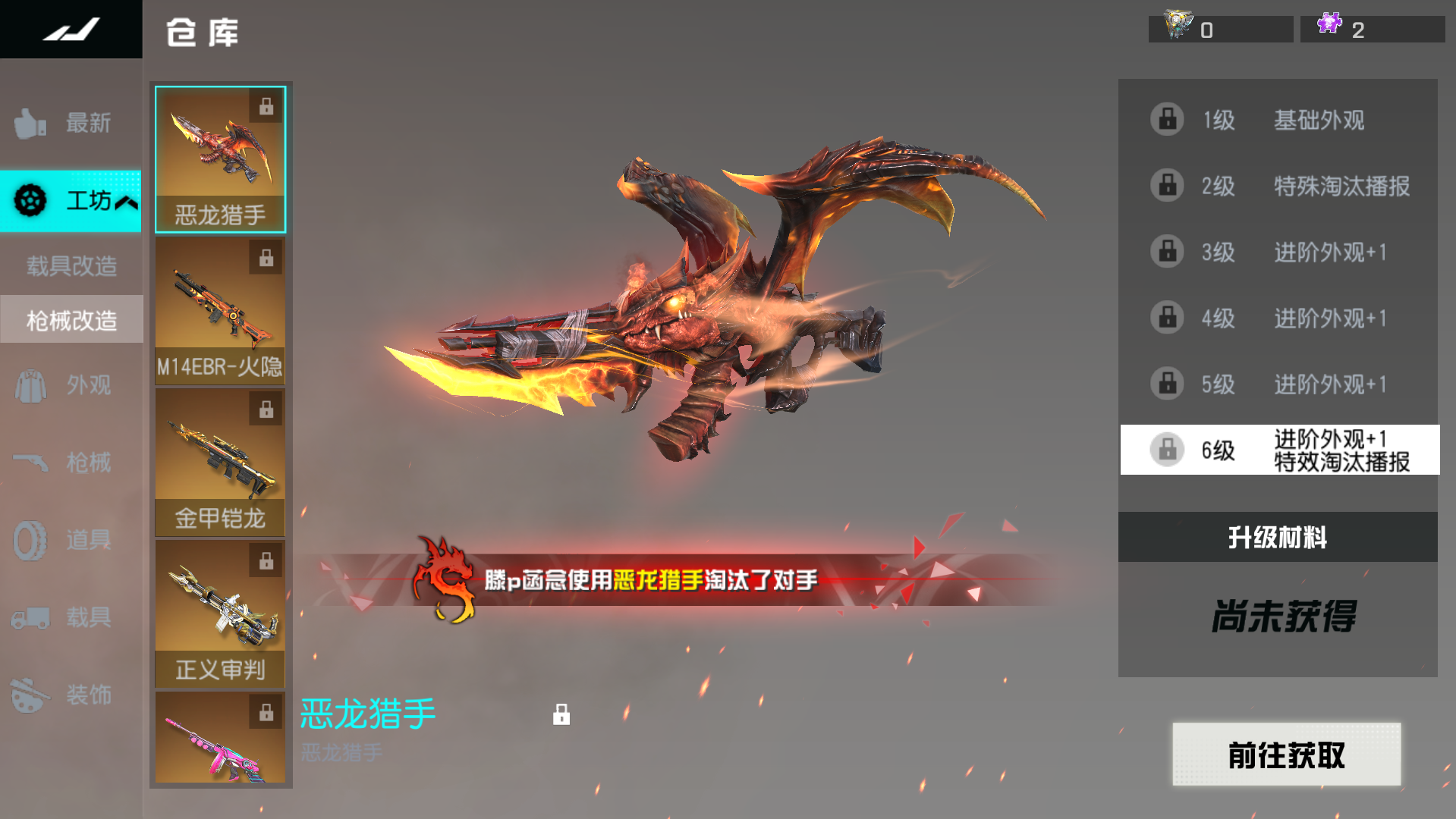仓库-升级界面新增猎手-I枪械升级,玩家分解猎手-I后可以获得对应的恶龙猎手核心。消耗恶龙猎手核心和时装碎片即可升级猎手-I,获取新外观。最高可升级为恶龙猎手。