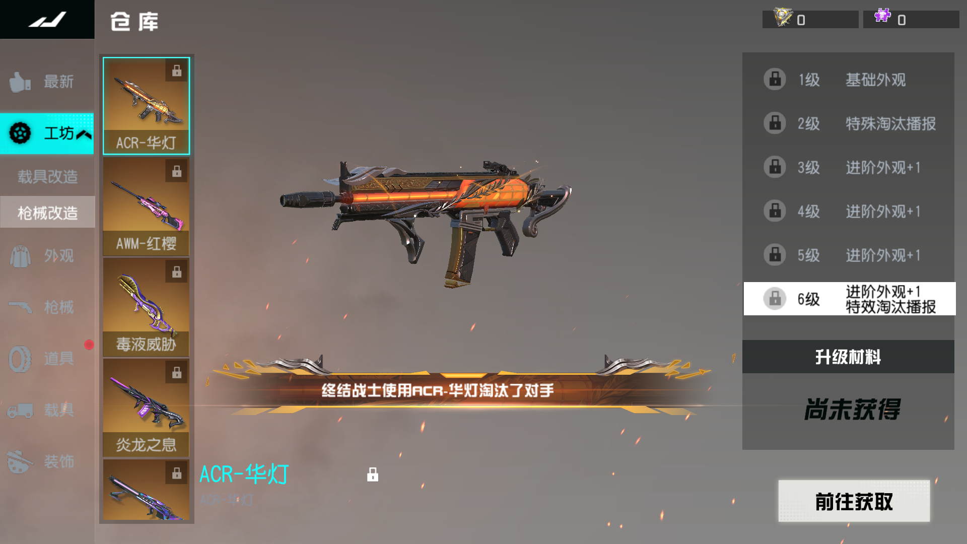 玩家可分解华灯-绿获取华灯核心。并在仓库-工坊-枪械升级界面消耗华灯核心和时装碎片升级华灯-绿,最高可升级为ACR-华灯。