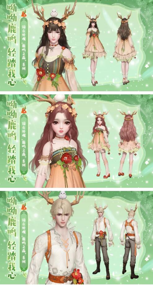 主题外观【鹿鸣之森】系列上架!点击【主界面】-【鹿鸣之森】按钮,即可开启本期锦梦外观,鹿鸣·鹿饮溪时装、鹿鸣·深林花事武器时装、鹿鸣·花欲燃发型,让我们换上新装和到来的伙伴共度这个浪漫的时节吧!