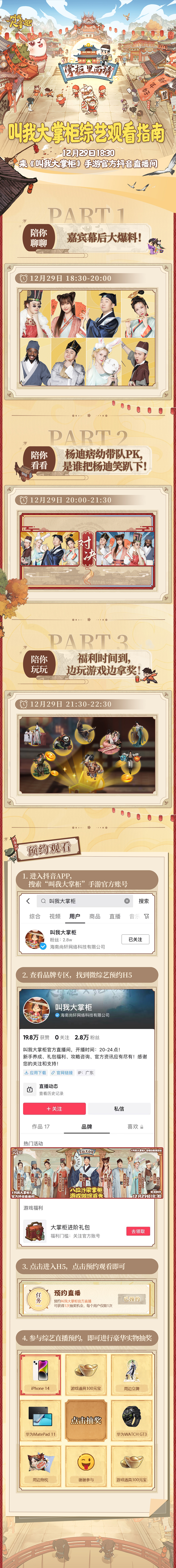 12月29日晚18:30,我们的微综《掌柜里面请》将在《叫我大掌柜》官方抖音直播间进行播出,直播间三大环节将为大家带来前所未有的视听观看体验,同时直播全程还有海量福利让你拿到手软!小玉不仅准备了大量红包、嘉宾签名照,还有各种惊喜实物大奖等你来拿!