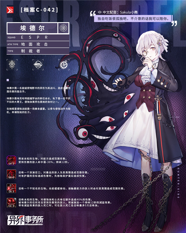 埃德尔,外号触手,得名于她独特的攻击方式,由于她的外号十分具有代表性,甚至很多老板更熟悉她的外号而忘记了她的本名。作为一个4费狙击手,触手可谓是开荒的神,杂鱼的杀手,亦是士兵队的克星。相信不用曜灵说,大部分老板都绝对会第一时间把她请进自己的公司。但是曜灵需要稍微提醒一下老板们,在大后期的高难本和PVP中,她的出场几率并不是很高,所以蓝票紧缺的老板们可根据当前作战需求选择性考虑获取。