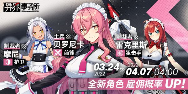 「弗罗拉女仆服务」所属,新角色SSR贝罗尼卡、SSR莉莉、SR摩尼以及R雷克里斯将于本周例行更新维护后全面实装!贝罗尼卡、摩尼以及雷克里斯的雇佣概率限时UP卡池将同步开放,莉莉将进驻新一期的制裁者季票。
