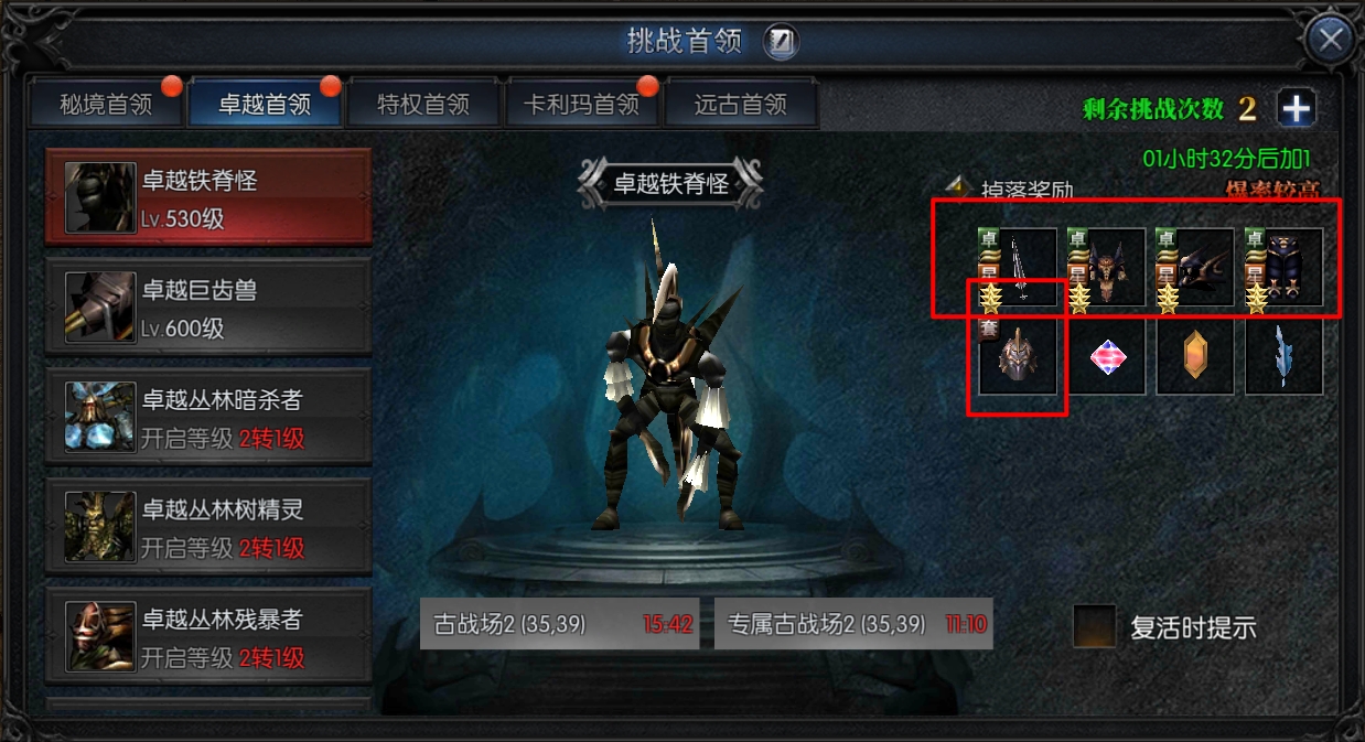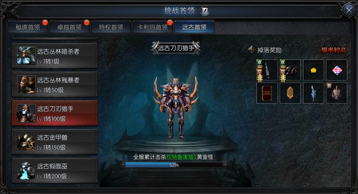 获取装备的一个重要来源是进行首领挑战,玩家可以在首领页面分别看到秘境、卓越、特权、远古、黄金蛋首领等
