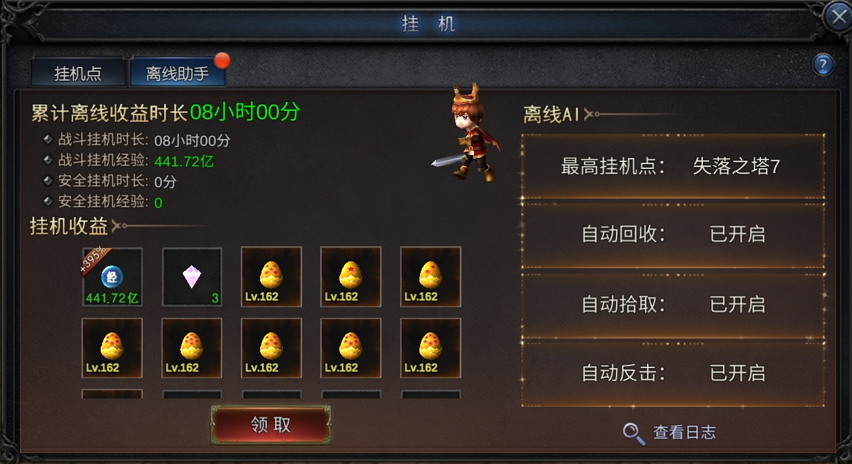 2、野外战斗挂机和离线安全挂机也是获取装备的一种方式,离线挂机可最多累计8小时收益,会按照目前角色的最高挂机点实时进行挂机,挂机时间比较久的玩家在获取的装备放满背包后,其他的则会通过邮件补发哦