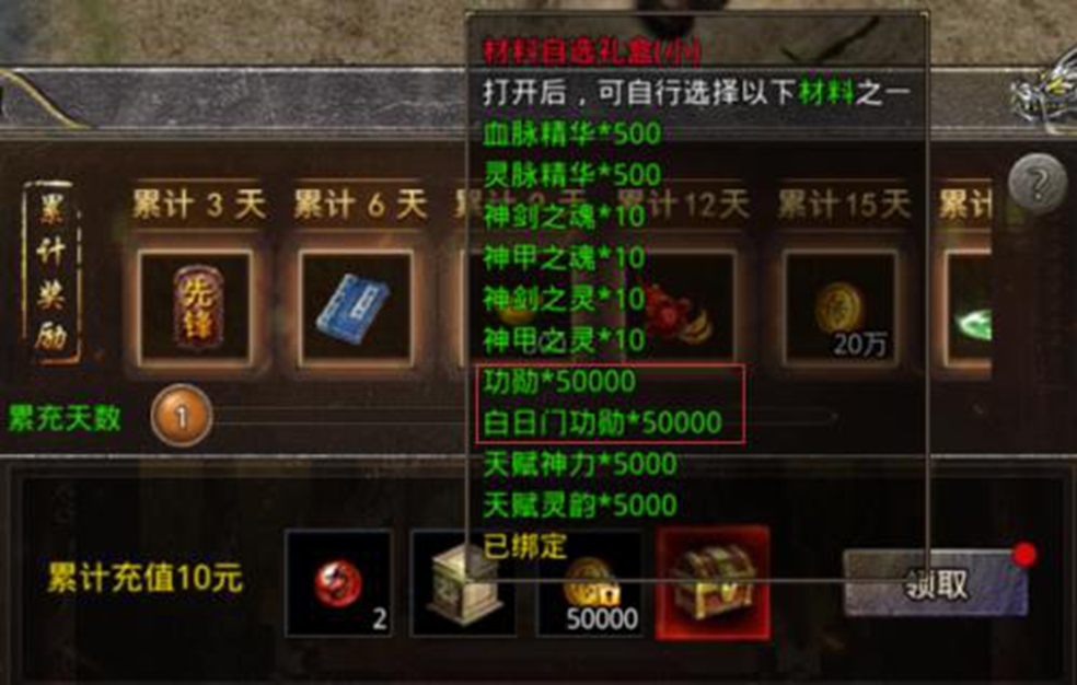 3、每日充值累计充值处的材料自选礼盒开启也可以选择功勋进行获得。
