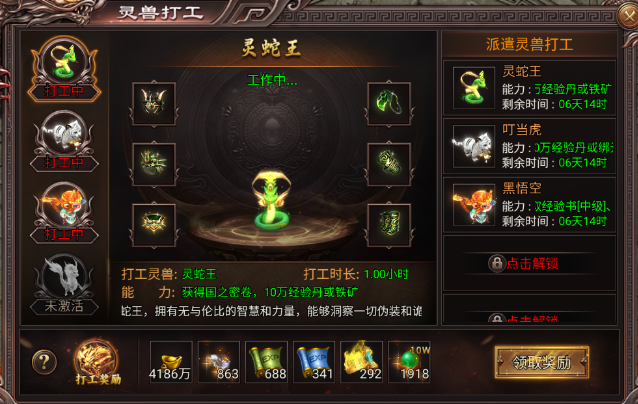 在虎卫迷宫,通过击杀怪物活动灵兽装备,激活灵兽提升战力,还可派遣灵兽帮你打工,获取经验卷轴,国之秘卷,派遣更多灵兽,获取大量国之秘卷,轻松解锁高阶大陆。