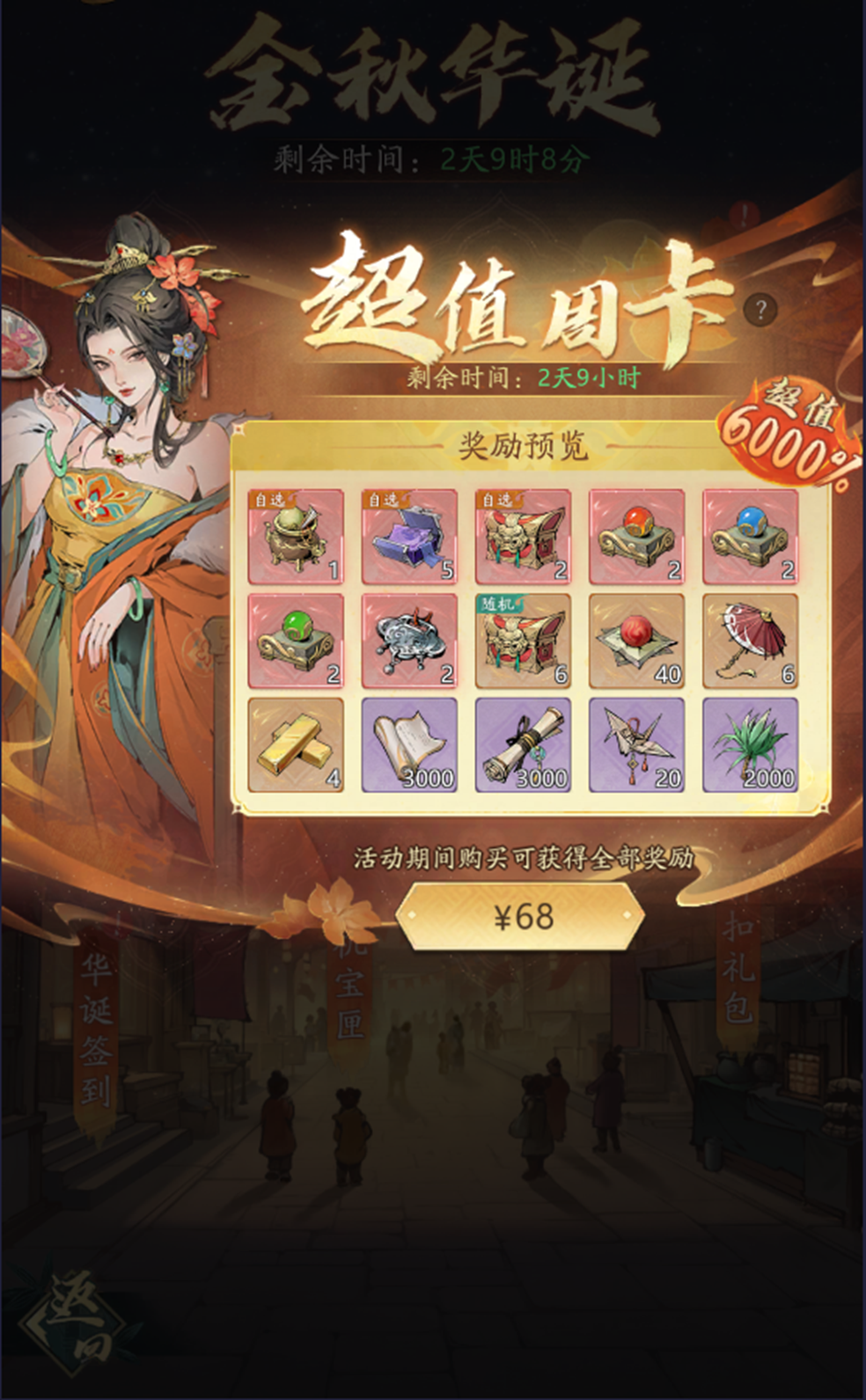 活动开放期间开启限时礼包的购买,购买可获取大量宝石、宝匣钥匙、国庆专武奖励
