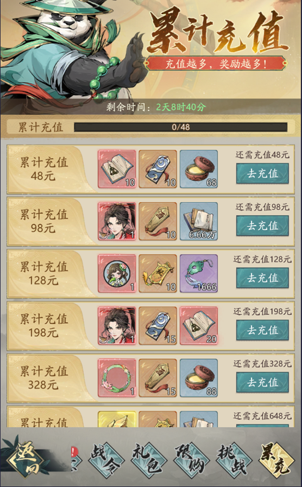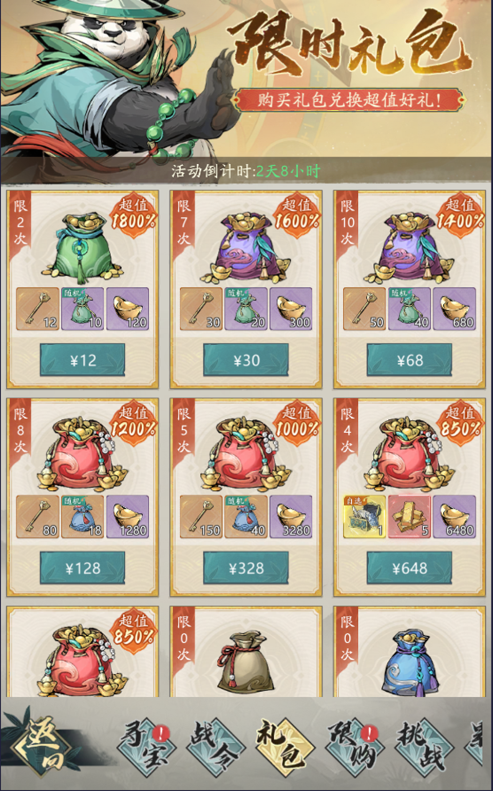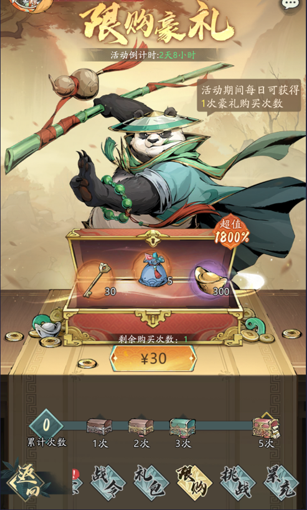 除限时礼包外,每日还有一次特殊限购礼包的购买次数,获取超值返利同时,累充购买次数达到一定进度还可以额外获取宝典令、武学精要、秘宝令、明光蜡、地字通鉴录、行酒令、随机灵药宝匣等奖励。