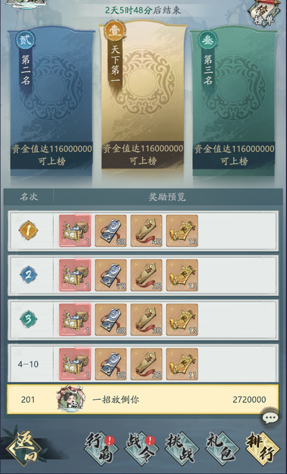 4.活动期间将根据玩家个人资金值进行排行榜排行,在活动结束后根据排名发放奖励邮件。