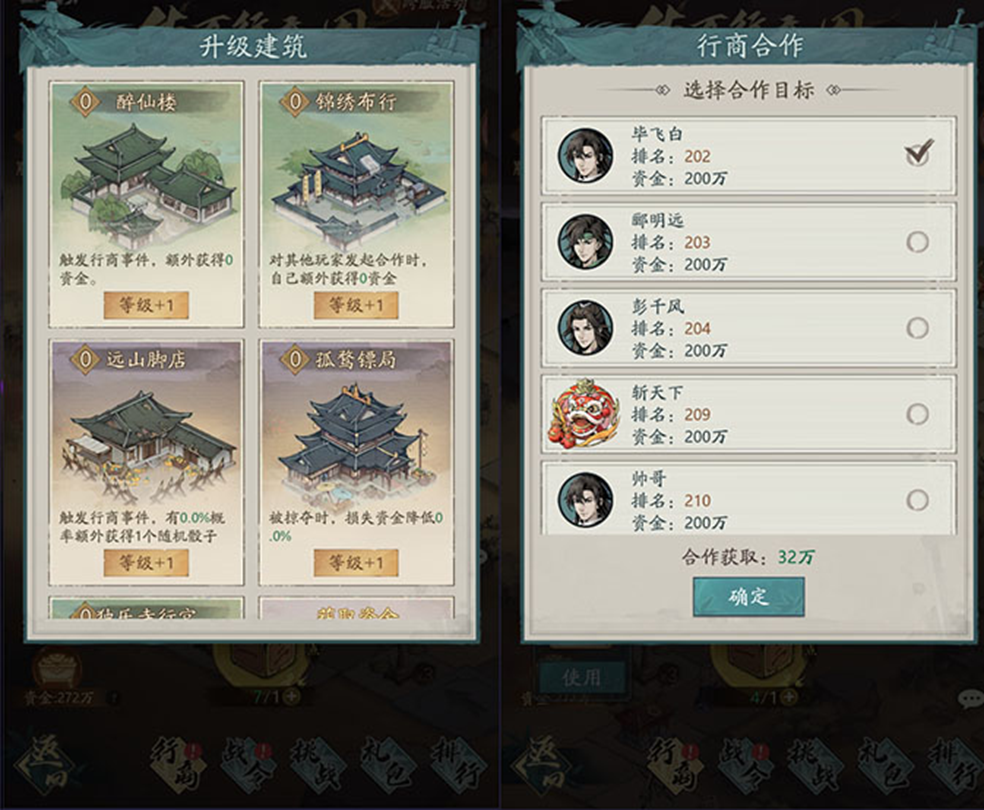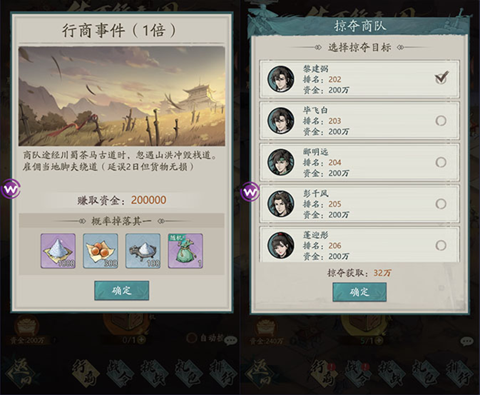 华夏行商活动玩家需要投掷骰子来获得前进步数,前进途中可能遇到行商事件、掠夺商队、升级建筑、行商合作等事件,其中行商事件有1-3倍区别,影响玩家获取到的行商资金与物品。