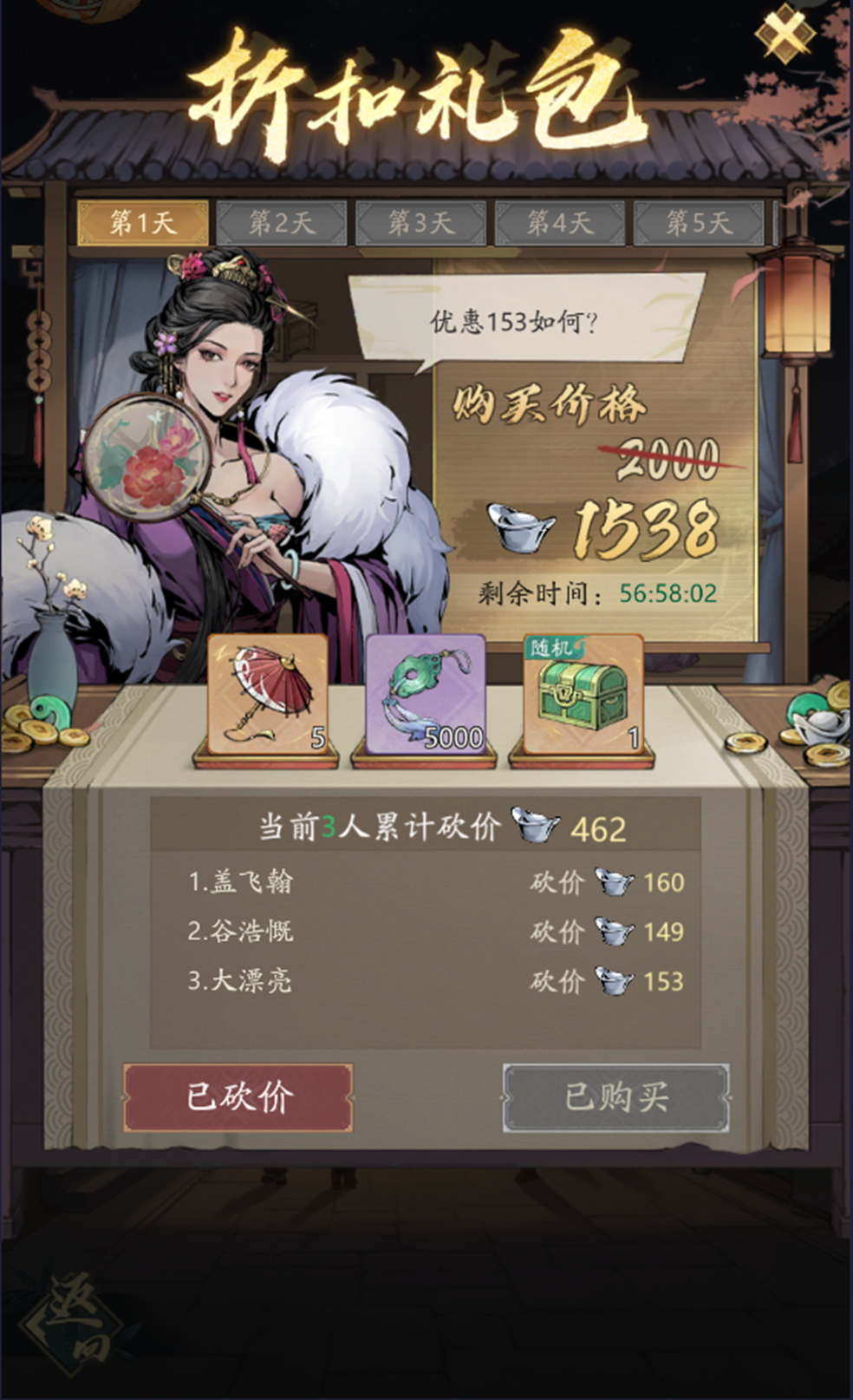 活动期间每日解锁一种折扣礼包,全服玩家购买前可砍价,当购买价格比当日最终价格低时,会补发差价。