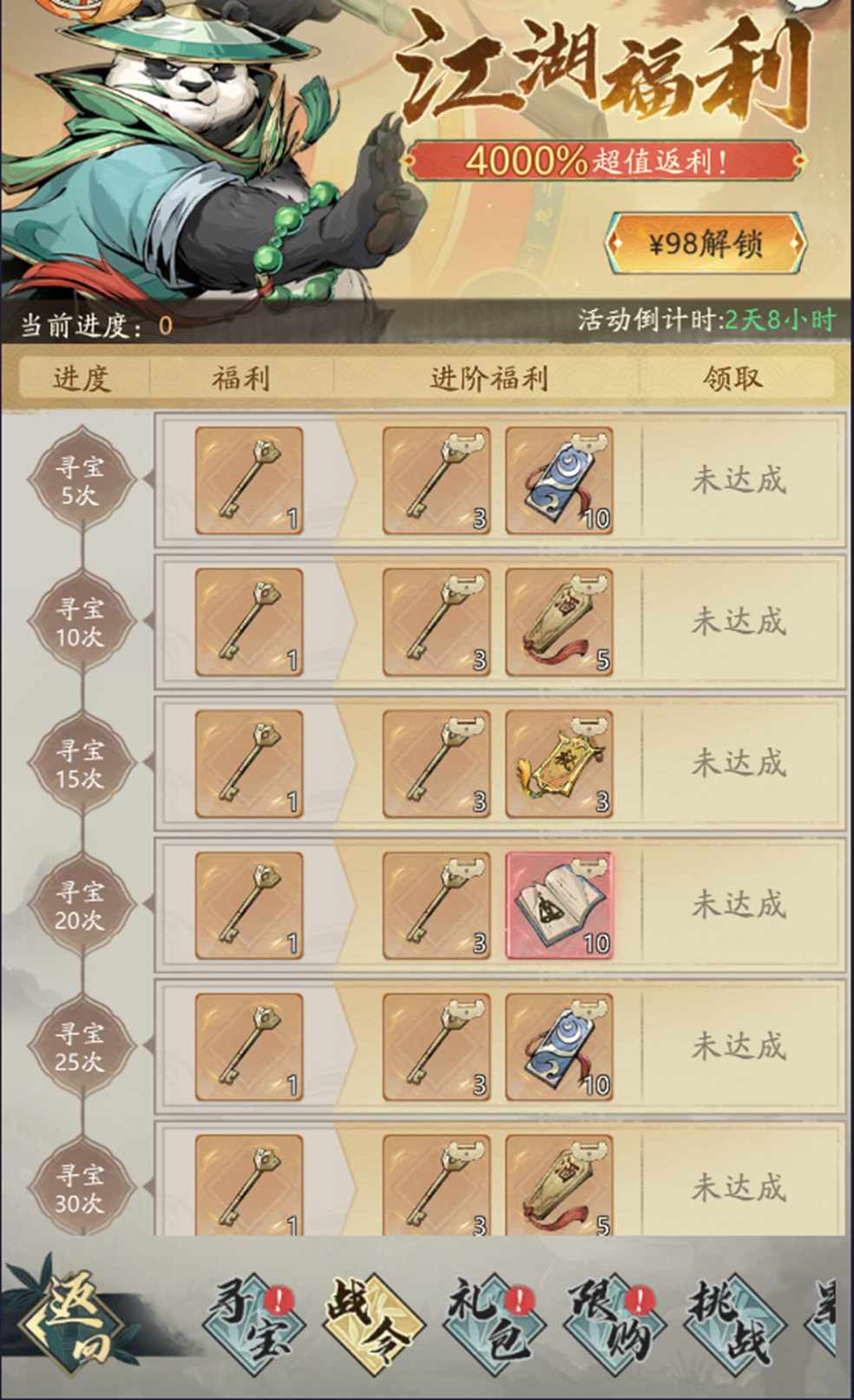 活动期间可购买对应的战令,每次寻宝到一定的次数即可领取对应数量的宝匣钥匙,用于天机宝匣寻宝使用。