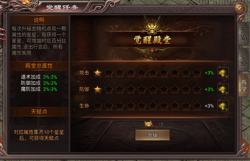 → 每次升级随机点亮 攻击、防御、生命 中的一颗星(+3%对应属性)。