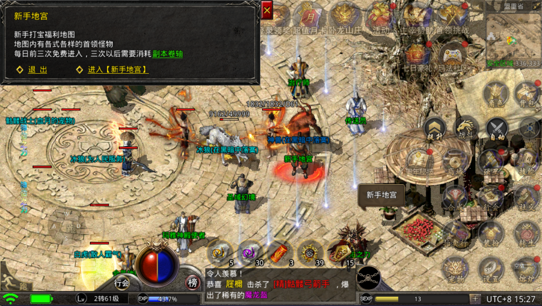 开服就开放的新手副本,每天有三次免费进入的机会进入不限制时间,次数消耗完毕也能使用副本卷轴进入,新手地宫持续开服前15天,15天后就关闭是为了新手玩家更好的上手游戏。