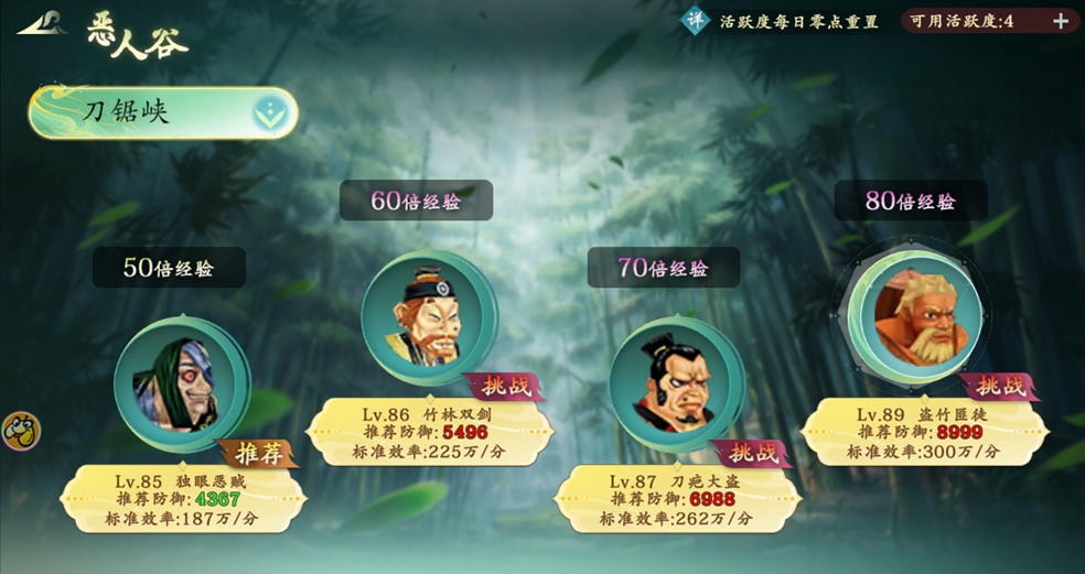 “恶人谷”:该活动作为游戏中主要的升级手段,需要玩家尽早解锁该模式,清理完日常任务后,获取活跃度,活跃度作为恶人谷的门票,活跃度越高,可以在恶人谷获取收益的时间越长。
