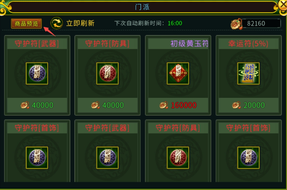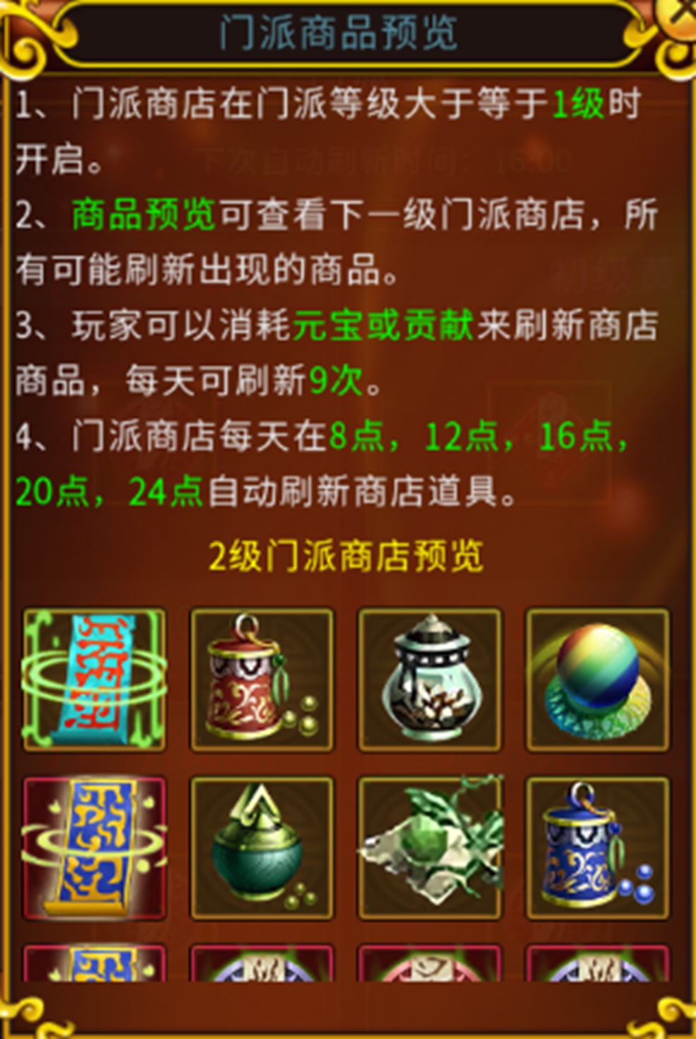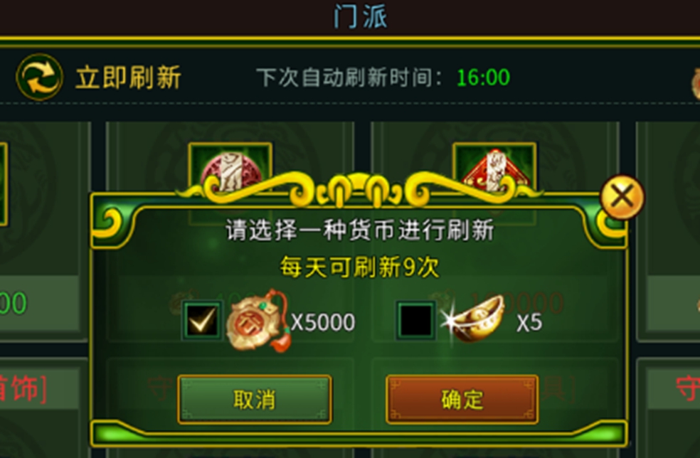门派商城的商品每天都有固定的自动刷新时间,即:每天在8/12/16/20/24点自动刷新商店道具。如果我们不想用贡献值或者元宝刷新的话呢,可以等到下一自动刷新时间点再进行兑换道具奖励。只要时间充足耐心等待,也能不用到贡献值或者元宝来换取自动刷新后的新道具。