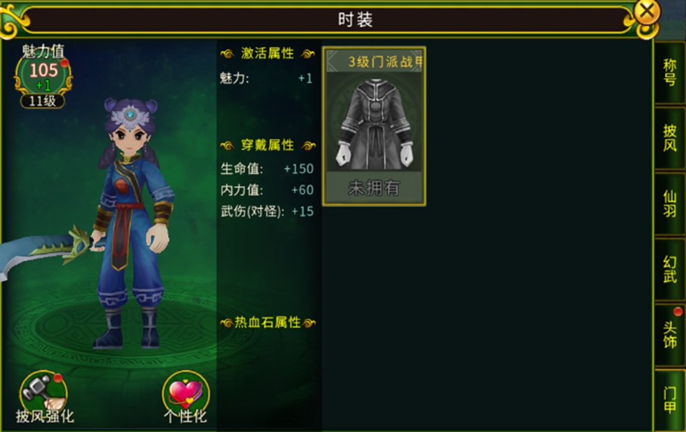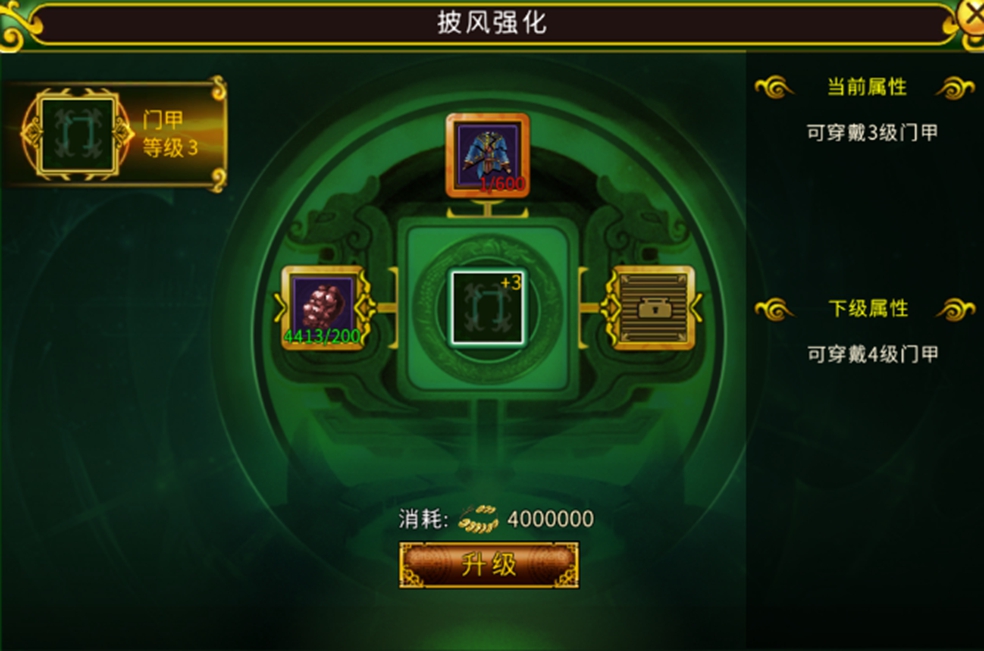 门派等级达到3级之后,也是一个新的转折点了,这时我们能在门派商店中有概率刷新到门派战甲了,除此之外还能通过兑换到门甲碎片,到披风强化系统中来升级门甲的等级。门甲的等级越高,所需的材料也会越多,但是升级后所增益的属性也大大增加,所以升级门甲对我们角色来说也是很有必要的。