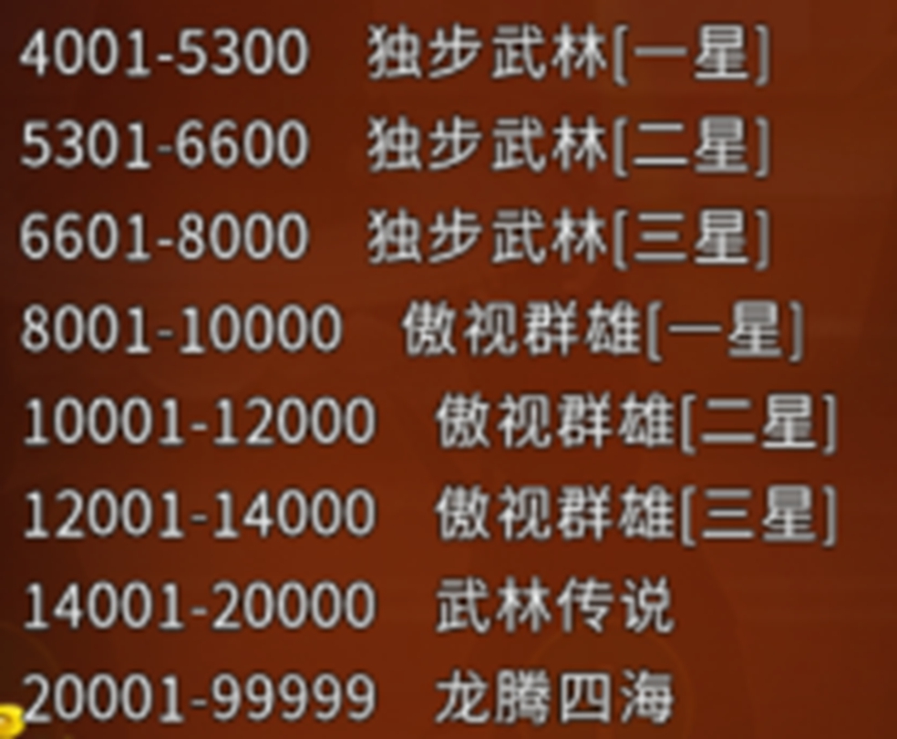 “武林新秀”为极武烈战的初始段位;该活动中一共有17个段位称号,即从初始段位的“武林新秀”到最高段位的“龙腾四海”,对战胜利可以获得相应的积分,达到段位所需的积分要求后就能提升段位了。