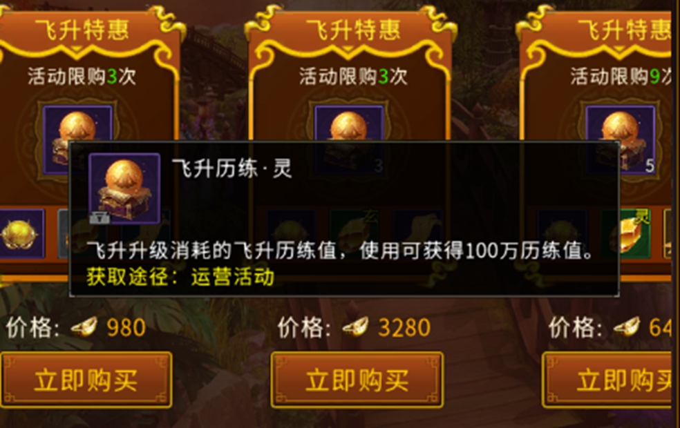 精彩特惠礼包与前面的限时直购礼包不一样,一共有三个档位的特惠礼包可直接使用元宝进行购买。购买后我们将会获得飞升历练·灵的历练丹道具可直接使用,以及加成200%飞升历练经验的飞升历练丹、天机石、仙攻符这三种道具。如果急需天机石来合成升级飞升装备品质的话,那么这些礼包中也是能购买获得不同阶段的天机石升级品质材料的。