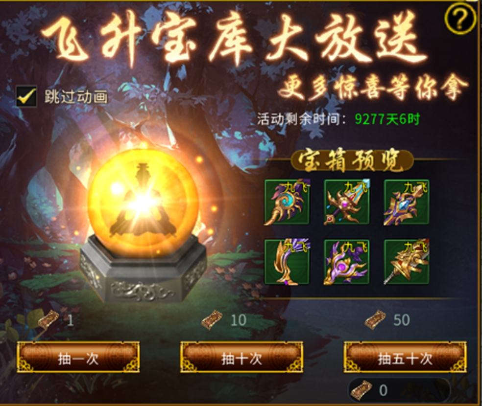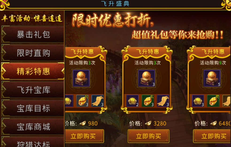 限时直购礼包则可以根据个人需要,通过直接购买所需的每一档礼包来获得奖励,其中要记住的是只有30和98元的直购礼包是只能购买1次的。直购礼包中购买获得的飞升抽奖券我们可以用来在“飞升宝库”中使用抽奖,每次抽奖有概率会获得飞升装备、飞升历练或者飞升材料等稀有道具。最后还能在“宝库目标”中领取累计抽奖的次数奖励。